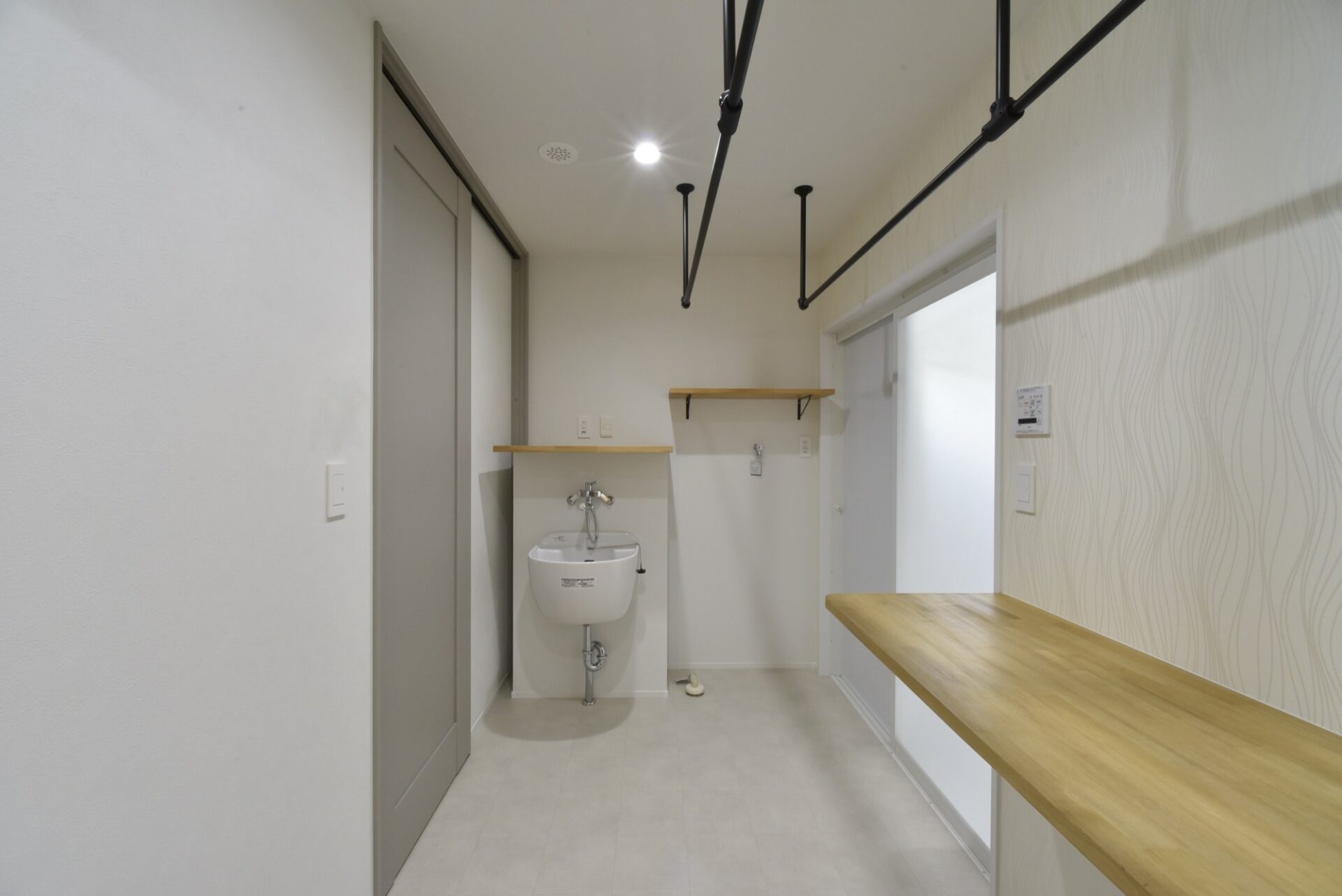 天井には2列のアイアンバーを設置し、室内干しもおまかせのユーティリティスペース。スロップシンクと洗濯機の上に棚を造作し、空間を活かしています。