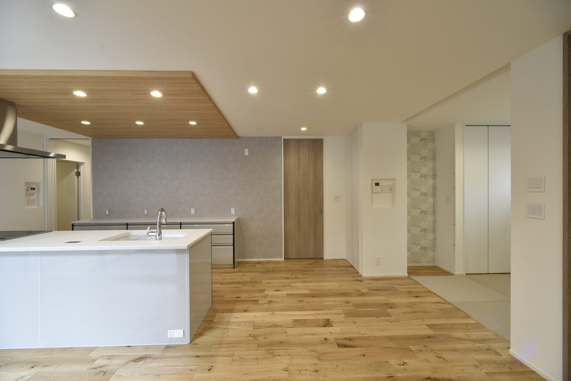 家の中心となるLDKには、3帖の畳コーナーを併設。ハイサッシやハイドアを採用し、開放感と高級感を兼ね備えた仕上がりに。