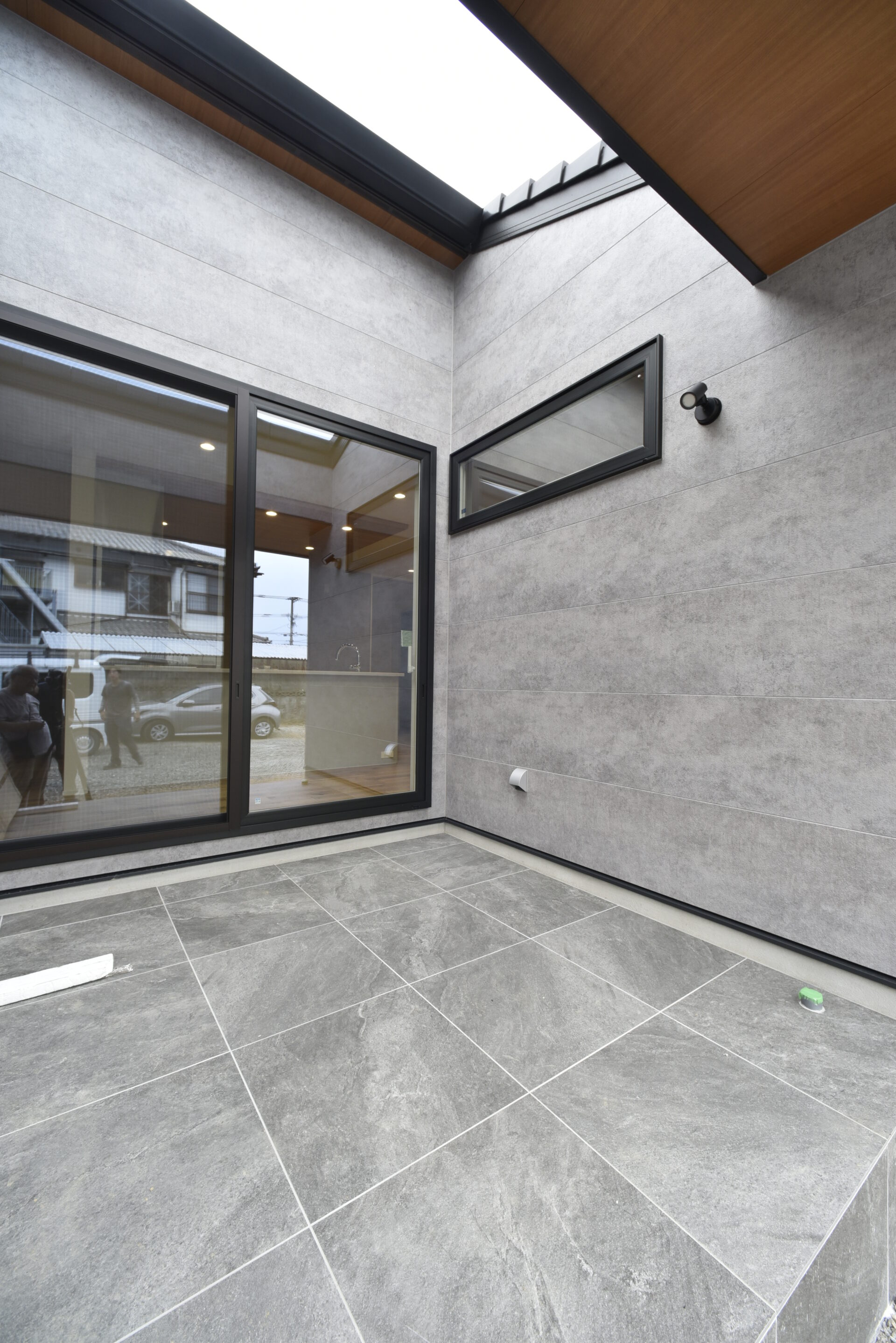 タイルテラスの前に設けられた木格子が、ナチュラルな温かみを添え、住まいにやさしい表情を加えます。