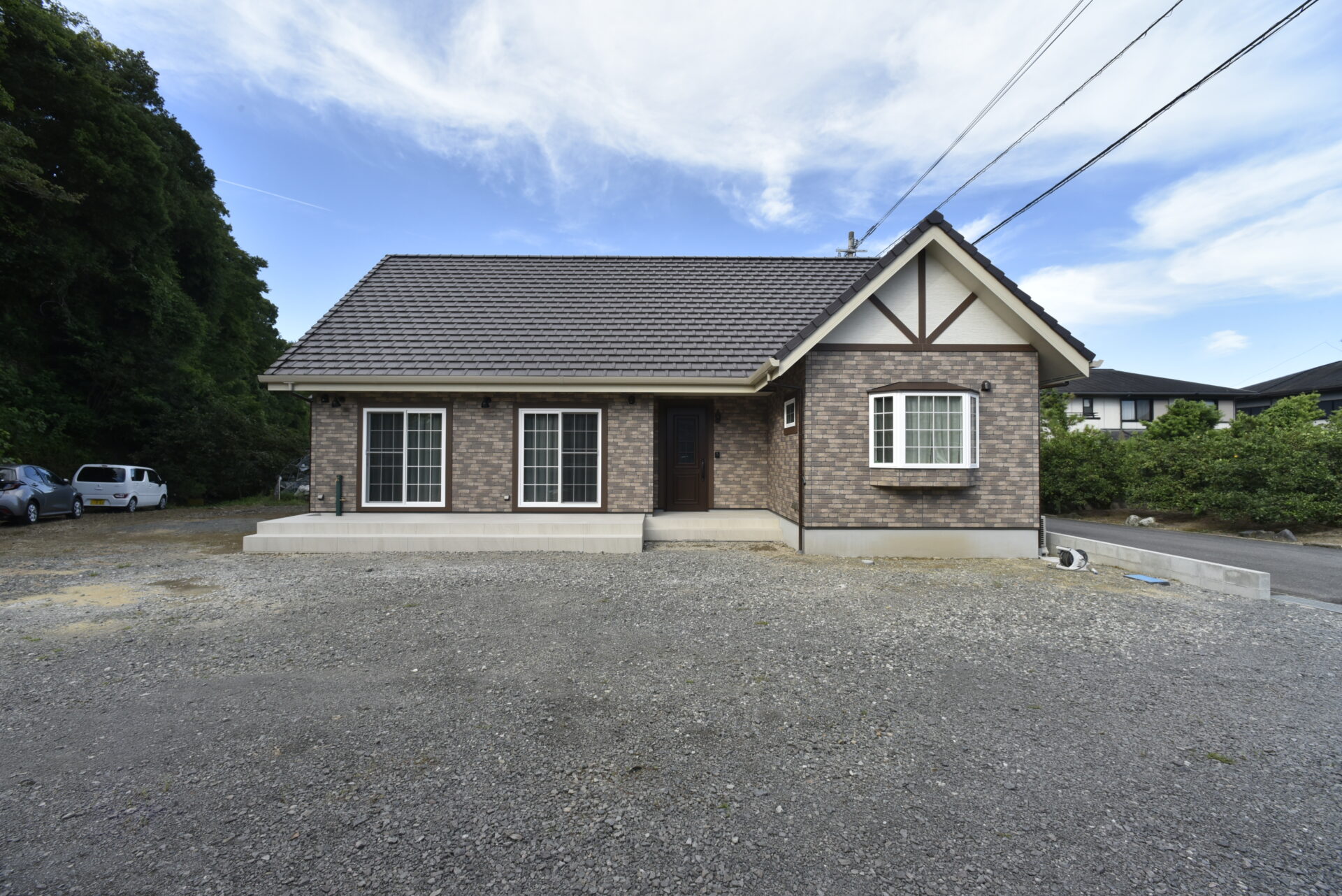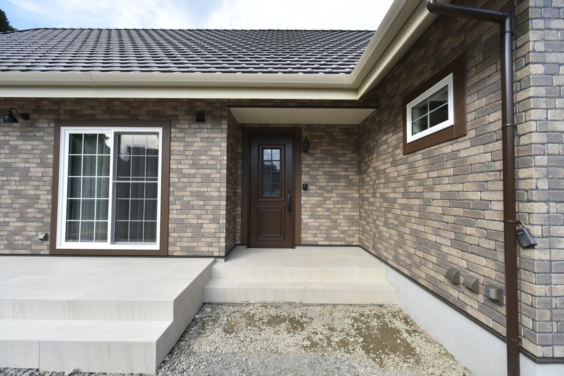 温かみを感じさせる北欧風の外観。レンガ調の外壁と瓦屋根で、かわいらしく上品な雰囲気。ブラウンの窓枠が全体を引き締め、統一感のある美しいデザインです。
