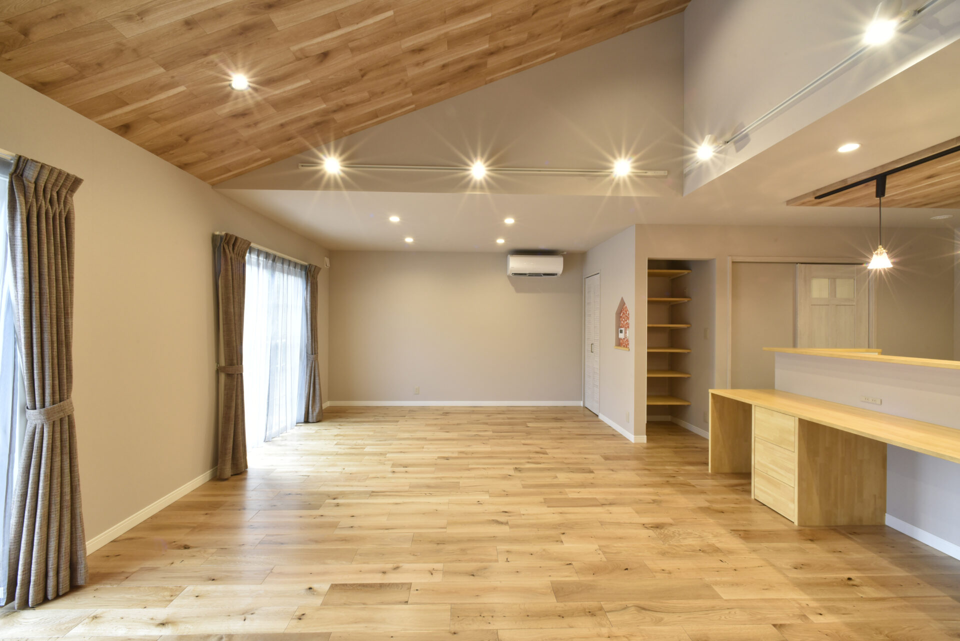 約25帖もの広々としたLDK。リビングは縦の空間を活かした勾配天井で、開放感たっぷり。平屋ならではのゆったりとした空間設計です。