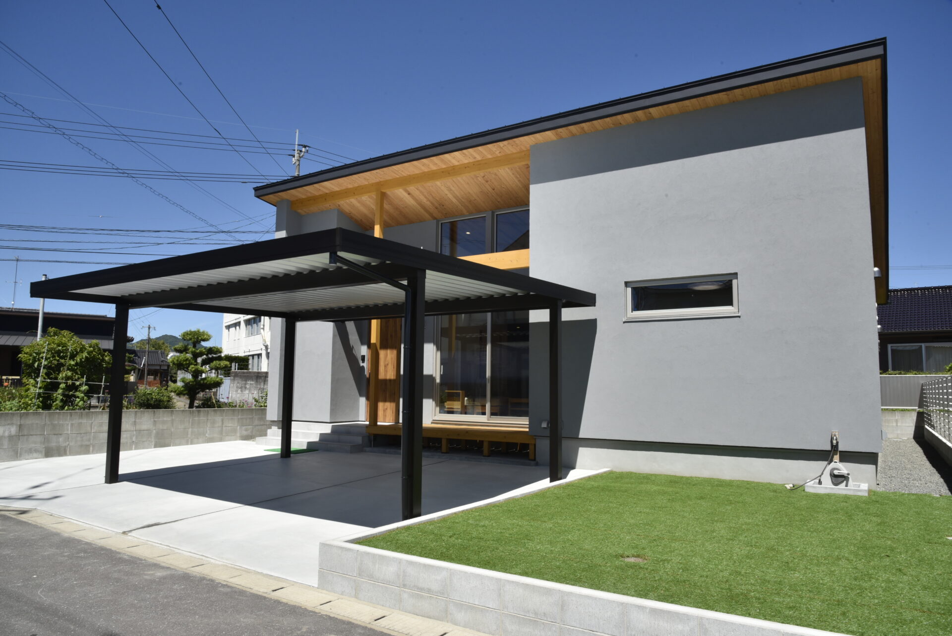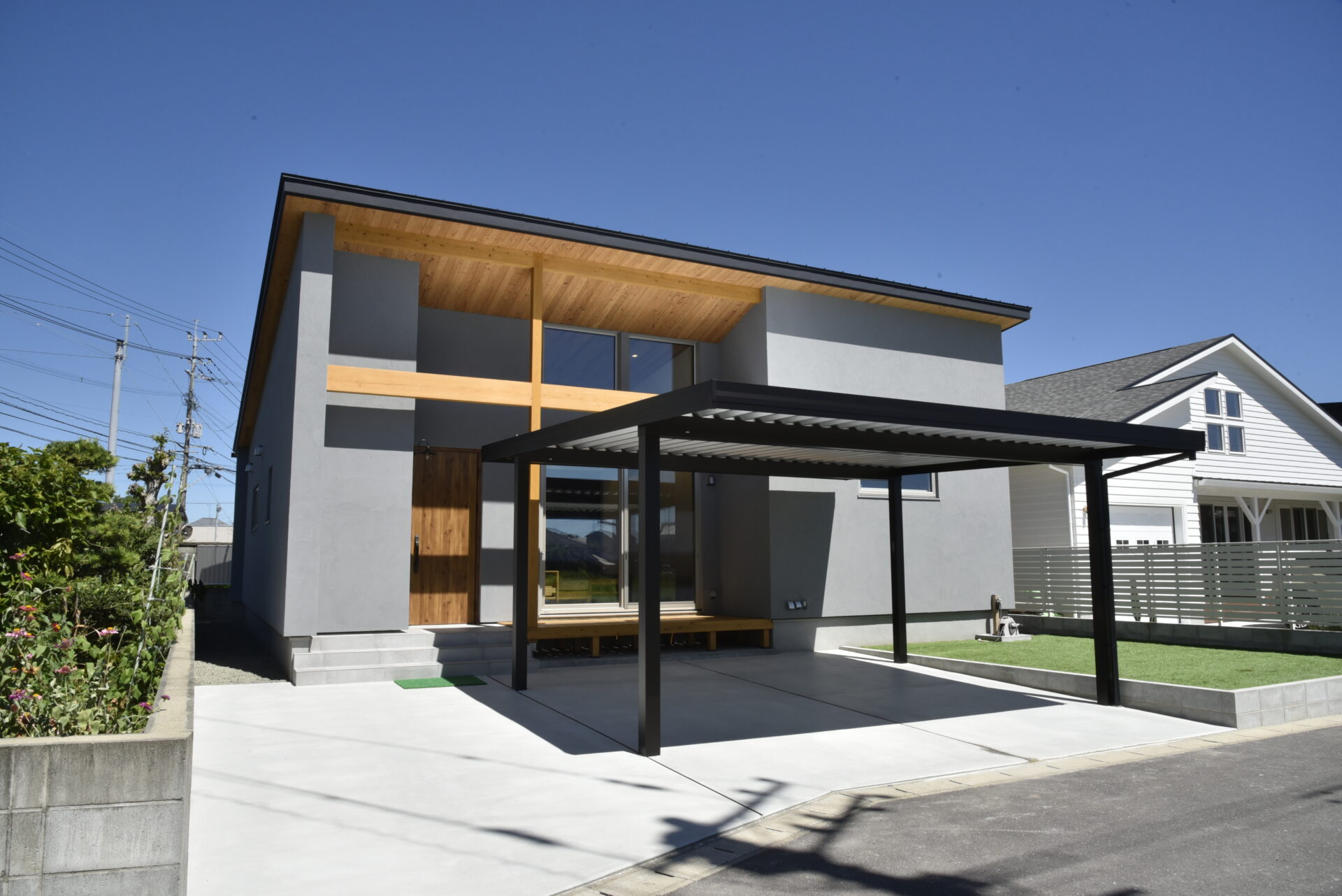 ナチュラルモダンな、すっきりとしつつも温かみを感じる外観。外壁材は世界シェアNo.1のドイツの塗り壁「Sto」を採用しています。雨水と一緒に汚れが落ちる、クラックが少ない、断熱性・通気性に優れるなど、耐久性の高さが魅力です。