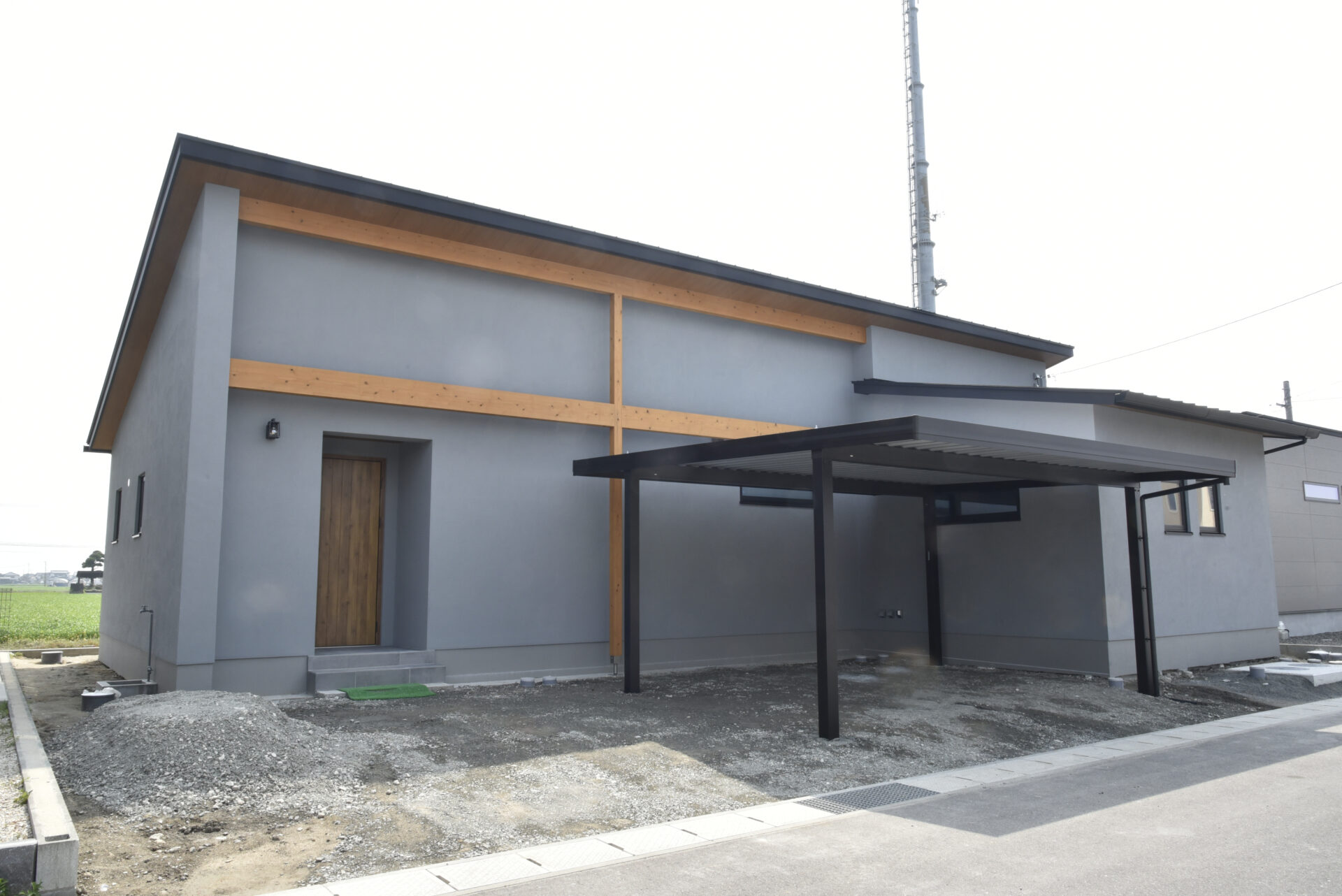 塗り壁「Sto」の上質な質感が際立つ、シンプルモダンでスタイリッシュな平屋。すっきりとしたフォルムに素材の美しさが映え、住まい全体に洗練された印象を与える外観です。