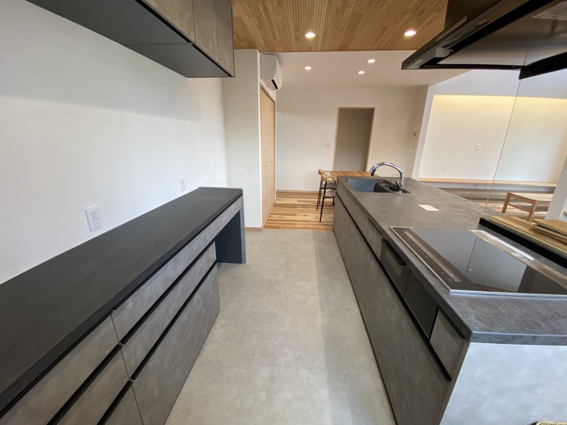 屋久杉の無垢床、身体に優しい素材のマシュマロタッチ、キッチン天井には高級感のある無垢の羽目板と、自然素材を五感で味わう住まいです。